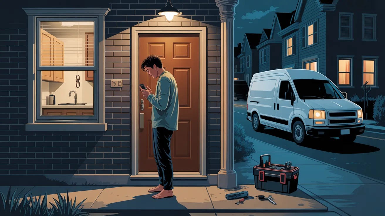 He pulled up in a van with no signage. Looked at your door for about six seconds. Pulled out a tool. Had it open in under a minute.