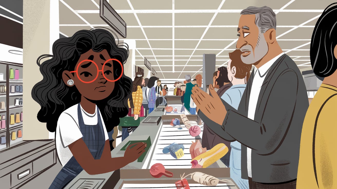 It was mid-afternoon, and the grocery store line was stretching longer than usual. My Dad and I stood behind a young cashier who looked ready to collapse. Her tight smile didn’t quite mask the exhaustion in her eyes.