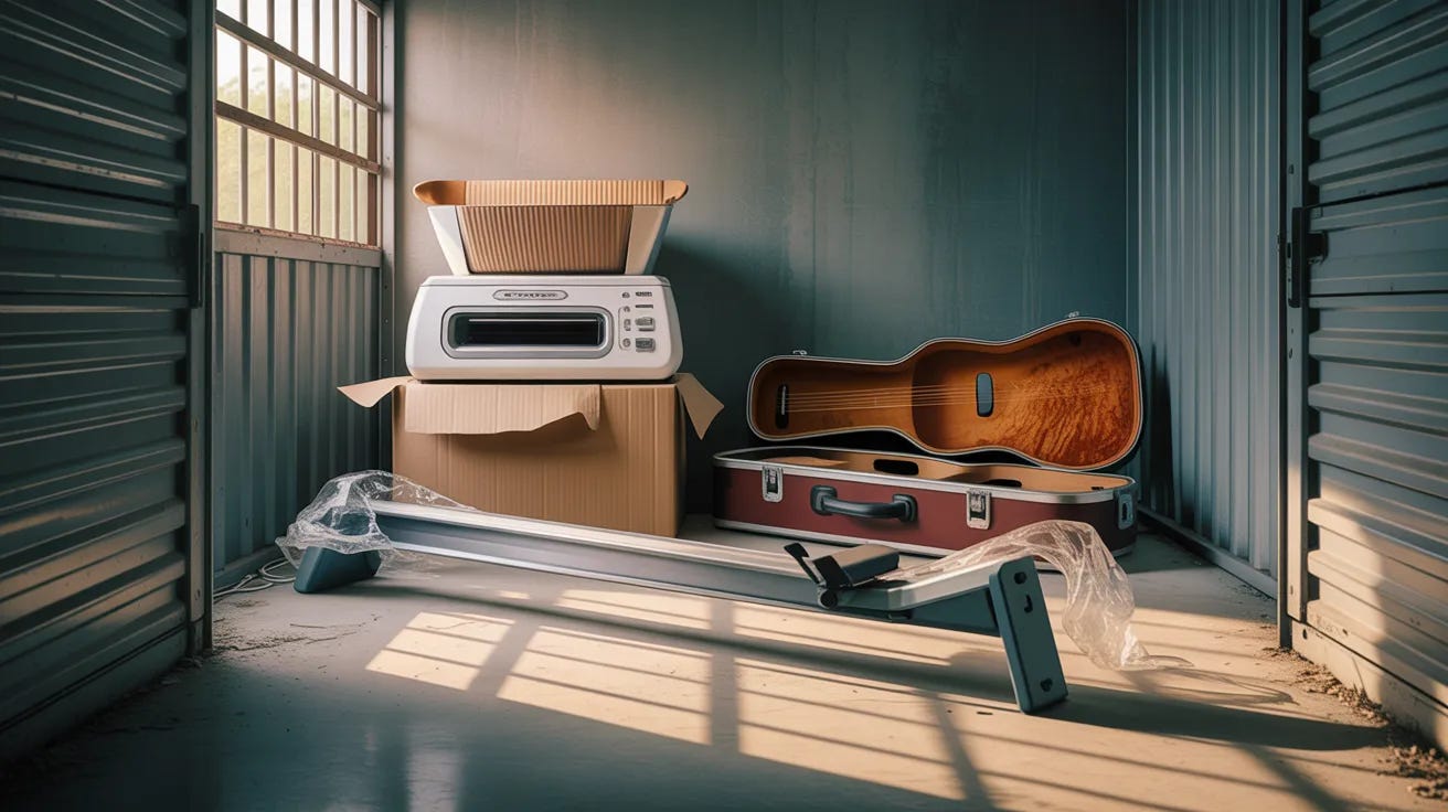 There was a bread maker in the original box. A guitar in a case, latches rusted shut. A rowing machine still wrapped in plastic film on two of its four legs, like someone got tired halfway through the unboxing and just … stopped.