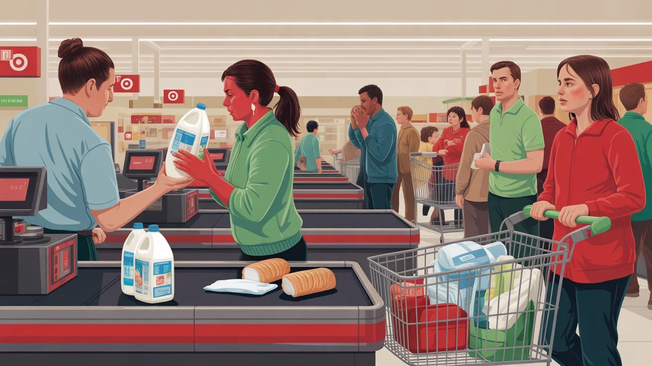 The woman in front of you unloads her cart. Milk. Diapers. That fancy organic bread.